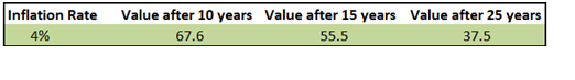 Assuming an average inflation rate of 4%, a 100 rupee note will buy goods worth only Rs. 37.5 after 25 years.